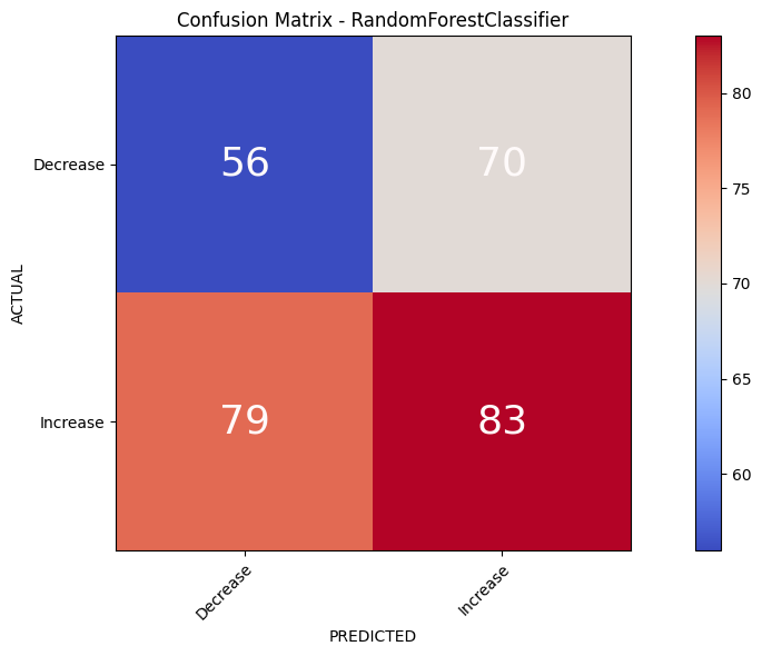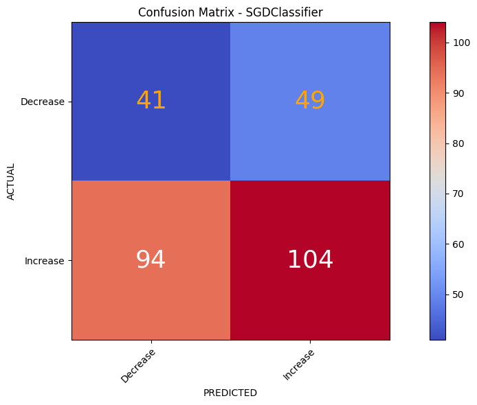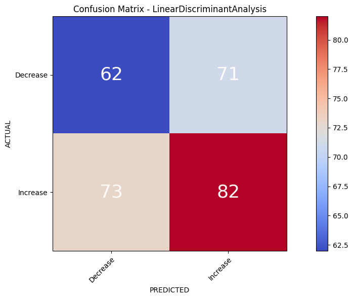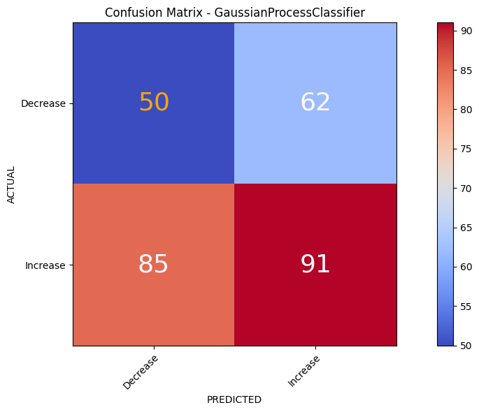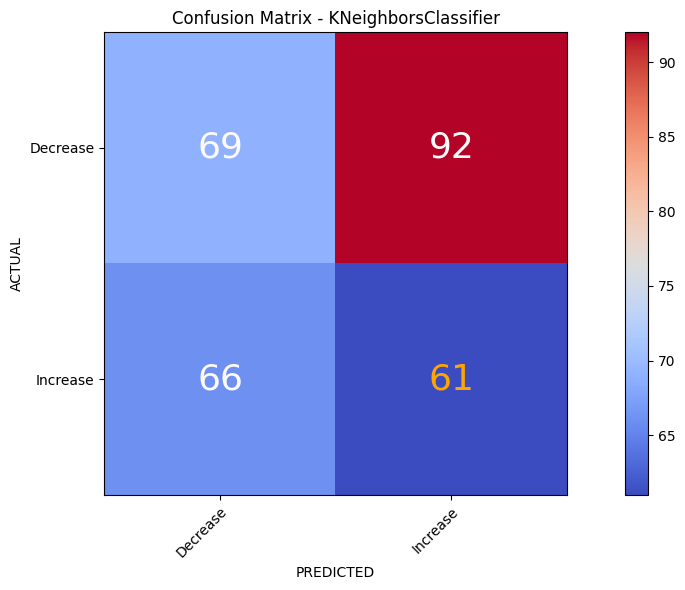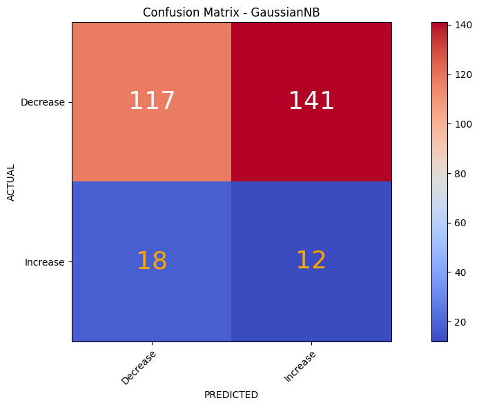 Precision and accuracy scores serve as performance metrics. It’s crucial to highlight that this process is implemented across all models. During our assessment, Gaussian Naive Bayes (GaussianNB) and Support Vector Machine (SVM) Classification stood out among the pool of eight models considered. Notably, GaussianNB displayed exceptional precision in identifying ‘Decrease’ movements with a score of 0.87, while SVM Classification achieved an impressive precision of 0.80 for ‘Increase’ movements.